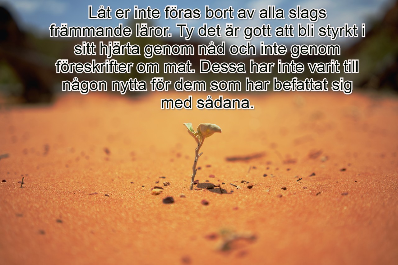 Hebr. 13:9 Låt er inte föras bort av alla slags främmande läror. Ty det är gott att bli styrkt i sitt hjärta genom nåd och inte genom föreskrifter om mat. Dessa har inte varit till någon nytta för dem som har befattat sig med sådana.