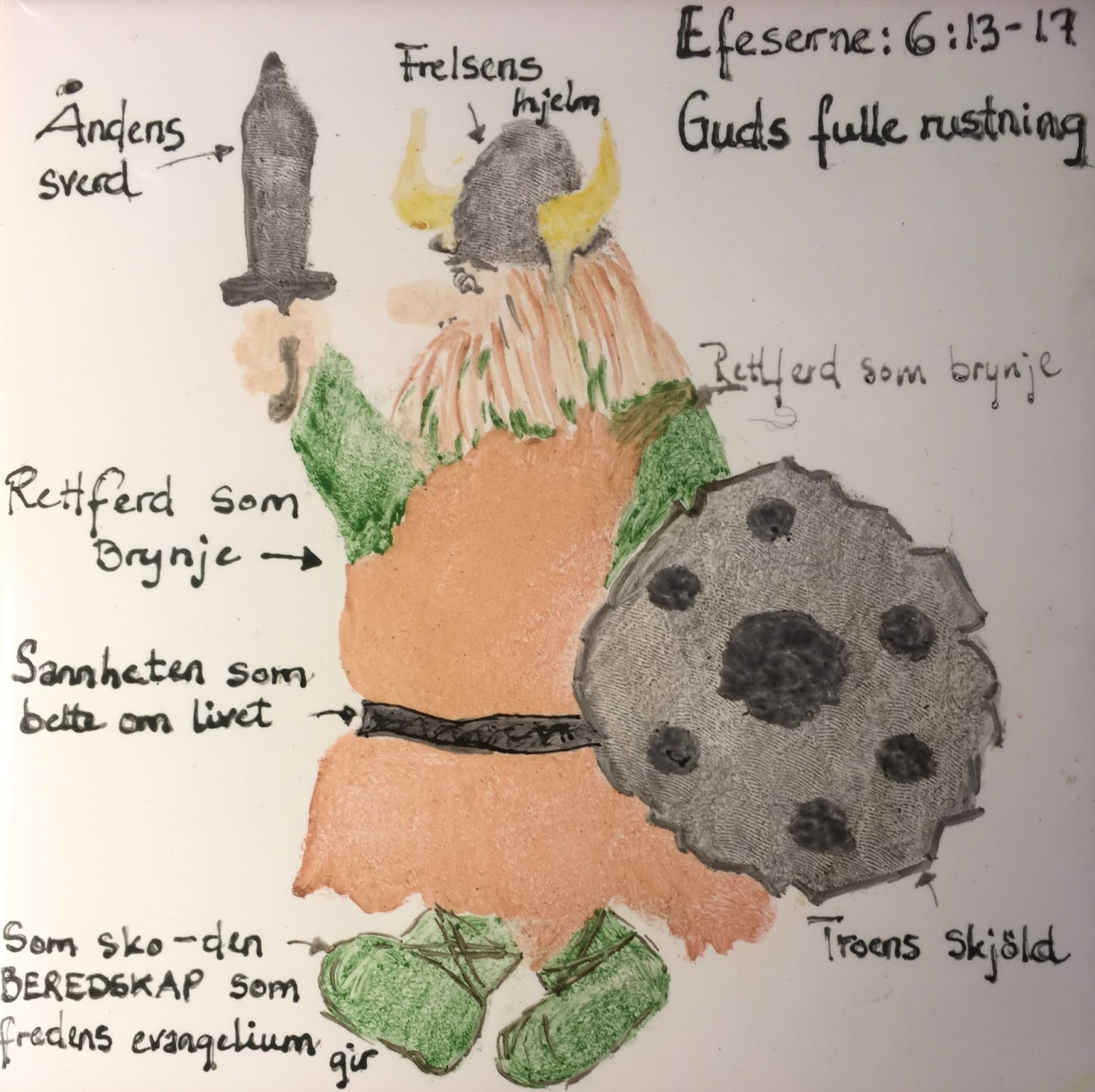 Ef. 6:10-19 Till sist, mina bröder, bli starka i Herren och i hans väldiga kraft. Ta på er hela Guds vapenrustning, så att ni kan stå emot djävulens listiga angrepp. För vår strid är inte mot kött och blod utan mot furstendömen, mot makterna, mot mörkrets världshärskare i denna världen, mot ondskans andemakter i himlarna. Ta därför på er hela Guds vapenrustning, så att ni kan stå emot på den onda dagen, och förbli stående när ni har fullgjort allt. Stå därför fasta, spänn på er SANNINGEN som bälte kring era höfter och kläd er i RÄTTFÄRDIGHETENS PANSAR och ha som skor på fötterna den beredskap som FRIDENS EVANGELIUM ger. Framför allt ta TRONS SKÖLD med vilken ni kan släcka alla den ondes brinnande pilar. Och ta FRÄLSNINGENS HJÄLM och ANDENS SVÄRD som är Guds ord, under all bön och åkallan, be alltid i Anden. Och vaka med all uthållighet och bön för alla de heliga, och för mig, att ord ska ges mig när jag öppnar min mun, så att jag med frimodighet gör evangeliets hemlighet känd. SRB16.