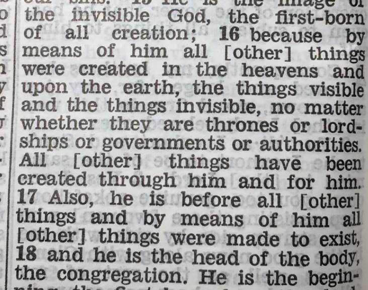 Våra biblar säger att Jesus är den som har skapat allt, och att det är skapat genom honom och TILL honom. Han är före ALLTING och ALLT består genom honom. Vi kristna håller detta för en självklar sanning, men inte JV. De har sin egen översättning med en helt annan tolkning, och det är faktiskt så att man blir mörkrädd när man läser NVÖ – Nya Världens Översättning.