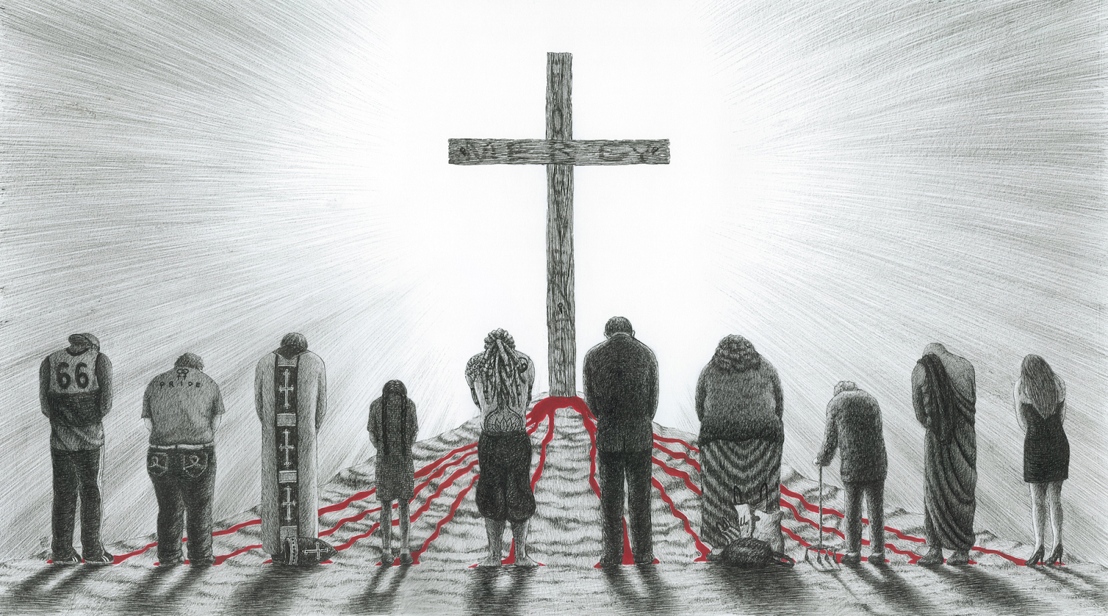 “32 Två andra brottslingar fördes också ut för att avrättas tillsammans med honom. 33 Och när de kom till den plats som kallas Dödskallen, korsfäste de honom och brottslingarna där, den ene på hans högra sida och den andre på hans vänstra. 34 Men Jesus sade: “Far, förlåt dem, för de vet inte vad de gör.” Och de delade hans kläder mellan sig och kastade lott om dem. 35 Folket stod där och såg på. Men rådsherrarna hånade honom och sade: “Andra har han frälst. Nu får han frälsa sig själv om han är Guds Messias, den Utvalde.” 36 Även soldaterna kom fram och hånade honom. De räckte honom surt vin 37 och sade: “Om du är judarnas kung, fräls då dig själv!”38 Över honom fanns det också ett anslag: “Detta är judarnas kung.” 39 En av brottslingarna som var upphängda där hånade honom och sade: “Är inte du Messias? Fräls då dig själv, och oss också!” 40 Men den andre tillrättavisade honom och sade: “Fruktar du inte ens Gud, du som är under samma dom? 41 Vår dom är rättvis, vi får vad vi förtjänar för det vi gjort. Men han har inte gjort något ont.” 42 Och han sade: “Jesus, tänk på mig när du kommer till ditt rike.” 43 Jesus svarade: “Jag säger dig sanningen: I dag ska du vara med mig i paradiset.” 44 Det var nu omkring sjätte timmen. Då kom ett mörker över hela landet som varade fram till nionde timmen. 45 Solen förmörkades, och förhänget i templet brast mitt itu. 46 Och Jesus ropade med hög röst: “Far, i dina händer överlämnar jag min ande.” När han hade sagt detta, gav han upp andan. 47 När officeren såg vad som hände, ärade han Gud och sade: “Den mannen var verkligen rättfärdig.” 48 När allt folket som hade samlats som åskådare såg vad som hände, slog de sig mot bröstet och vände hem igen. 49 Men alla hans vänner och kvinnorna som hade följt honom från Galileen stod på avstånd och såg detta.” (Luk 23:32–49)