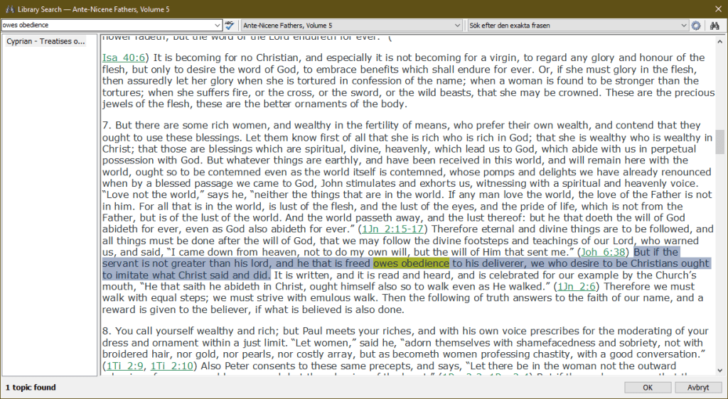 Cyprianus 200-258 e.Kr. “He who is freed owes obedience to his deliverer.” Ante-Nicene Fathers, Vol. 5, Tr.2, p. 432