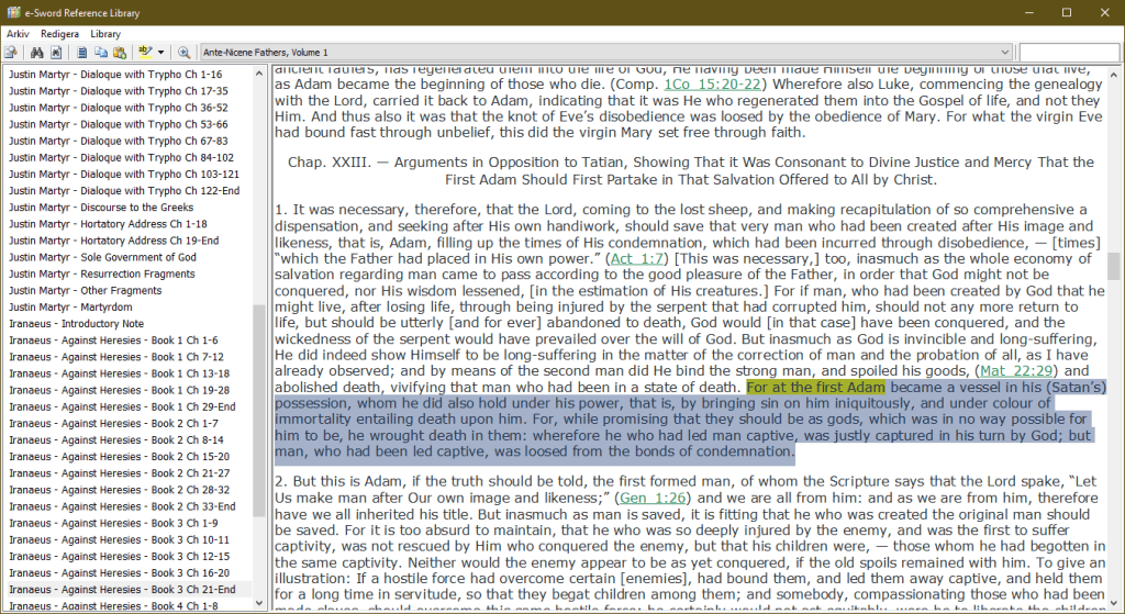 Irenaeus (120-202 e.Kr.) “For at the first Adam became a vessel in his (Satan’s) possession, whom he did also hold under his power, that is, by bringing sin on him iniquitously, and under color of immortality entailing death upon him.” Ante-Nicene Fathers, Vol. 1, Book 3, Ch. 21p. 456.