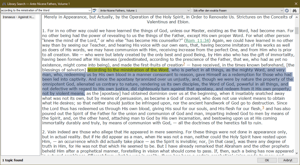 Irenaeus“…according to the ministration of the Word, who is perfect in all things, as the mighty Word, and very man, who, redeeming us by His own blood in a manner consonant to reason, gave Himself as a redemptionfor those who had been led into captivity. And since the apostasy tyrannized over us unjustly, and, though we were by nature the property of the omnipotent God, alienated us contrary to nature, rendering us its own disciples, the Word of God, powerful in all things, and not defective with regard to His own justice, did righteously turn against that apostasy, and redeem from it His own property, not by violent means…” Vol. 1, Book 3, ch. 1 p. 527.