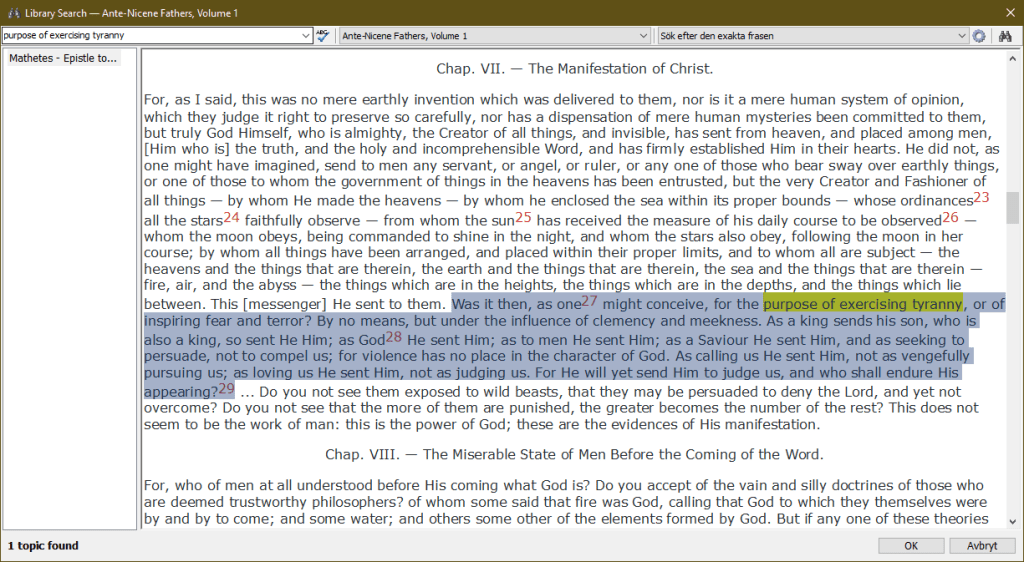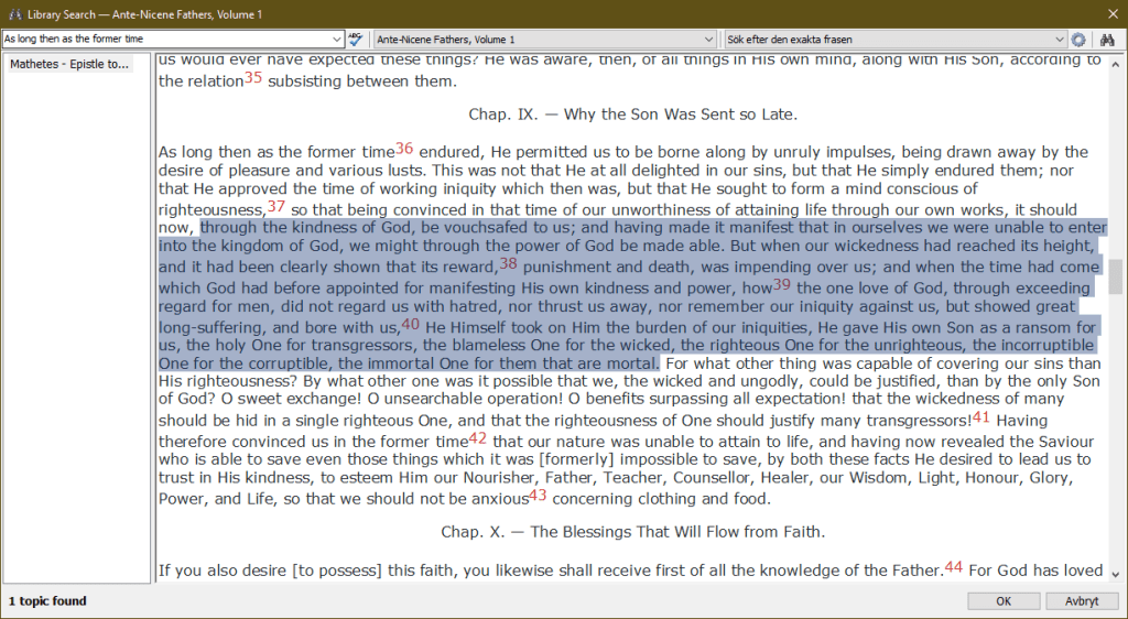 MathetesEpistle to Diognetus (Skrevs runt år 130 e.Kr.): As long then as the former time endured, He permitted us to be borne along by unruly impulses, being drawn away by the desire of pleasure and various lusts. This was not that He at all delighted in our sins, but that He simply endured them; nor that He approved the time of working iniquity which then was, but that He sought to form a mind conscious of righteousness, so that being convinced in that time of our unworthiness of attaining life through our own works, it should now, through the kindness of God, be vouchsafed to us; and having made it manifest that in ourselves we were unable to enter into the kingdom of God, we might through the power of God be made able. But when our wickedness had reached its height, and it had been clearly shown that its reward, punishment and death, was impending over us; and when the time had come which God had before appointed for manifesting His own kindness and power, how the one love of God, through exceeding regard for men, did not regard us with hatred, nor thrust us away, nor remember our iniquity against us, but showed great long-suffering, and bore with us, He Himself took on Him the burden of our iniquities, He gave His own Son as a ransom for us, the holy One for transgressors, the blameless One for the wicked, the righteous One for the unrighteous, the incorruptible One for the corruptible, the immortal One for them that are mortal. For what other thing was capable of covering our sins than His righteousness? By what other one was it possible that we, the wicked and ungodly, could be justified, than by the only Son of God? O sweet exchange! O unsearchable operation! O benefits surpassing all expectation! that the wickedness of many should be hid in a single righteous One, and that the righteousness of One should justify many transgressors! Mathetes – Ante-Nicene Fathers, Vol. 1, Epistle to Diognetus, Chap. IX,