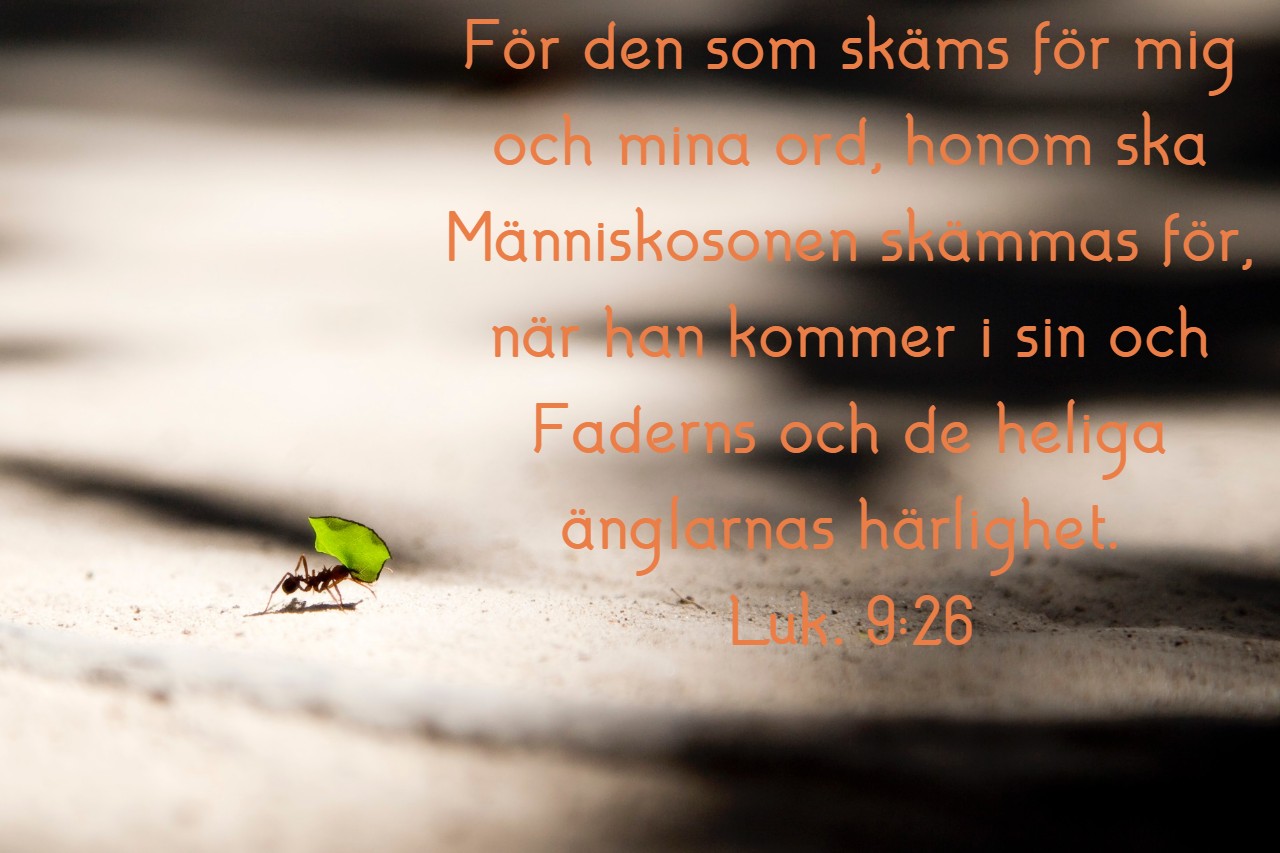 Luk. 9:26 För den som skäms för mig och mina ord, honom ska Människosonen skämmas för, när han kommer i sin och Faderns och de heliga änglarnas härlighet.