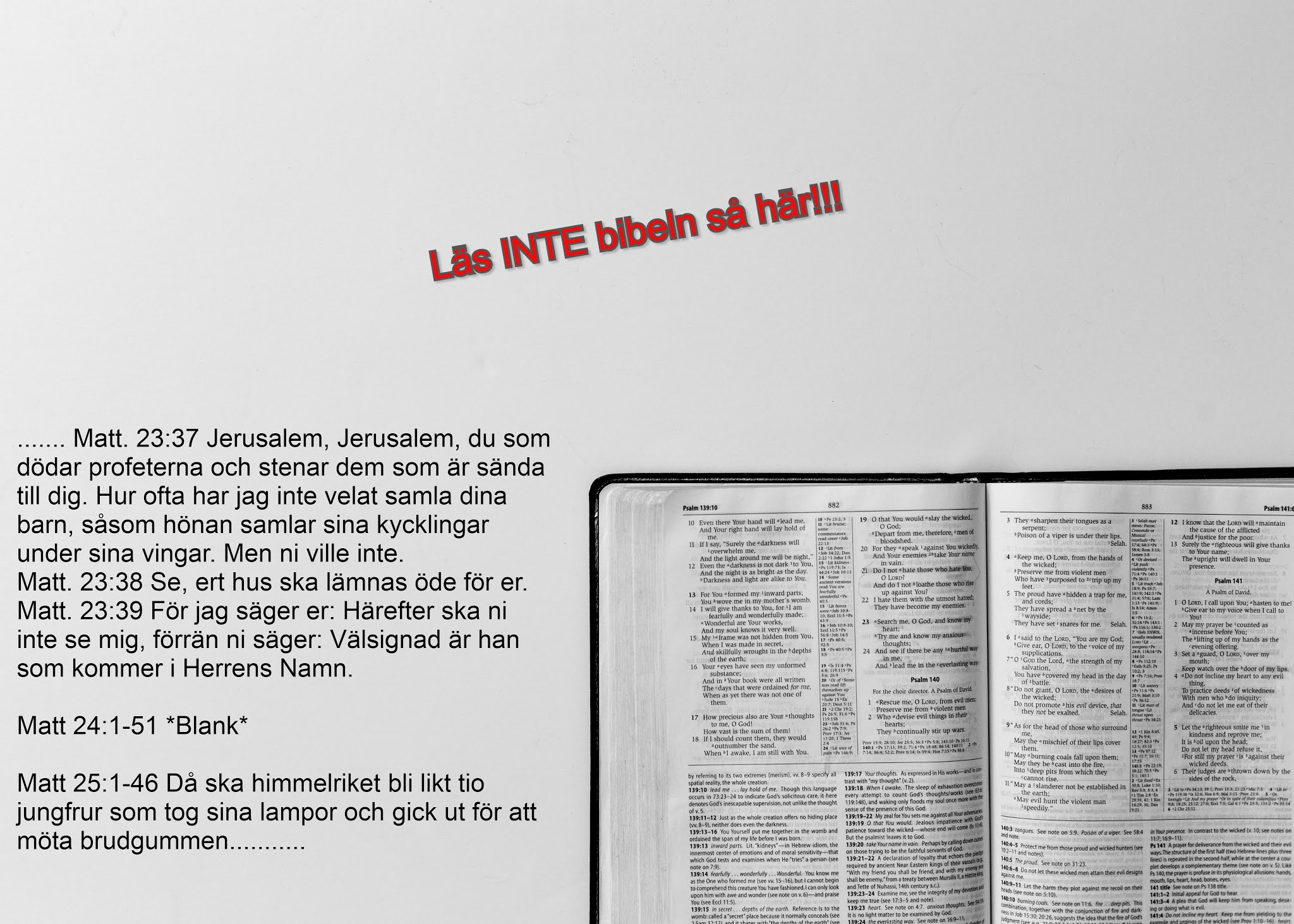 Ska vi ta din tanke vidare och vara konsekventameddet faktum att enbart 2 verser av hela det evangeliet innehållerordet församling, dågäller interesterande 1069 verser oss kristna. Vi har då bara2 verser att lägga på minnet, 2 verser som gäller oss. Och de två versernafinns i just Matteus. I så fall är Matteus evangeliet det enda som gäller oss kristna. Och det är justdär vi hittar Matt. 24 och 25 som vi diskuterar här.